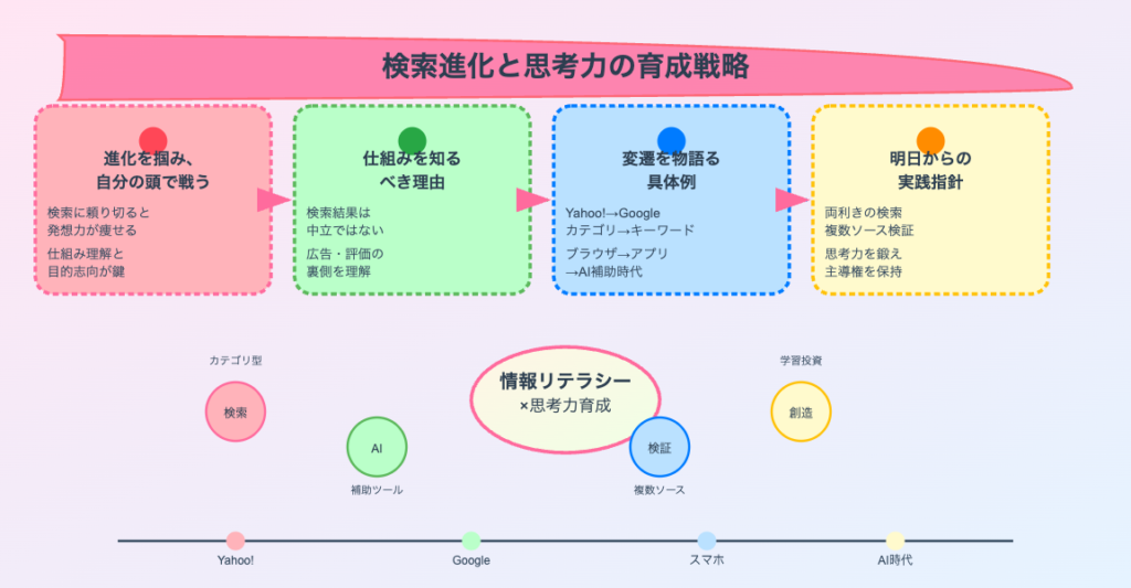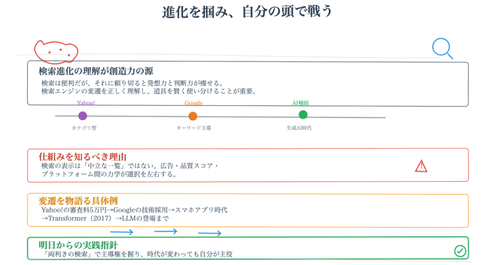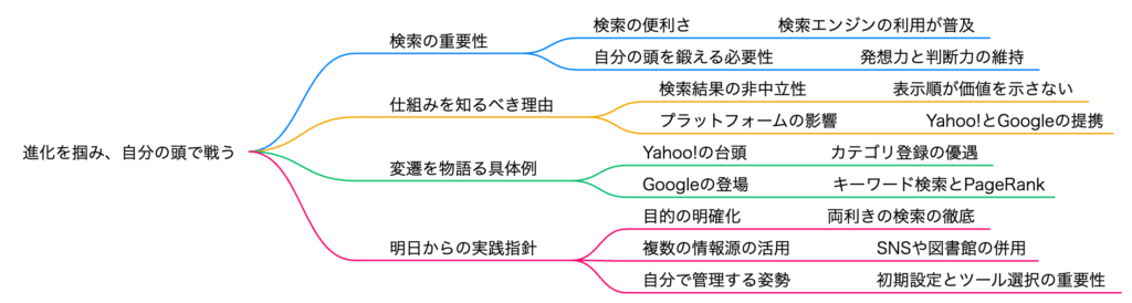 検索エンジンの歴史を振り返ると、人間の情報探索の方法が劇的に変化してきたことがわかります。Yahoo!のカテゴリー検索は、人間が手作業で情報を整理するという限界に直面しました。その限界を超えたのがGoogleのキーワード検索とページランクの仕組みでした。そして今、AI技術の進化により、私たちは再び大きな転換点に立っています。大規模言語モデルは、Googleが開発したトランスフォーマーの技術をベースに、確率的に正しい文章を生成できるまでに進化しました。しかし、技術の進化とともに、私たちは新たな課題にも直面しています。Facebookやスマホアプリの普及により、Googleでさえも全ての情報にアクセスできない時代になりました。情報の探し方が多様化する中で、私たちに求められるのは、ツールに依存するのではなく、自分の頭で考える力を養うことです。ローマ法王が言ったように、検索やSNSに頼りすぎず、自分の脳を鍛えることが重要です。情報リテラシーとは、単に検索が上手にできることではなく、情報を批判的に見る力、そして何より自分で考え、ひらめく力を持つことなのです。