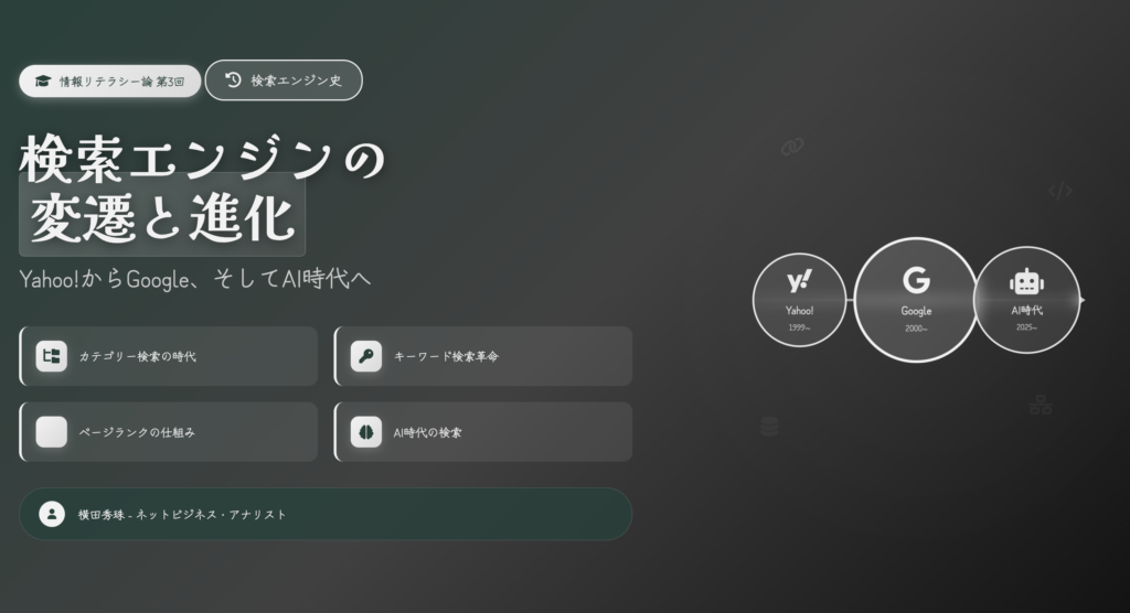 インターネットが普及して以来、私たちの情報探索方法は劇的に変化してきました。かつては膨大なカテゴリーから目的の情報を探し出していた時代から、今ではキーワードを入力するだけで瞬時に答えが見つかる時代へ。そして現在、AI技術の進化により、さらなる変革の波が押し寄せています。本記事では、2025年10月14日に長岡造形大学で行われた「情報リテラシー論」第3回の授業内容をもとに、検索エンジンの歴史を振り返ります。Yahoo!が世界を席巻した時代、Googleがいかにして検索の概念を変えたのか、そしてAI時代の到来が私たちの情報探索にどのような影響を与えているのか。ネットビジネス・アナリストの視点から、検索エンジンの変遷と進化の物語を紐解いていきます。この授業では学生からも多くの質問や感想をいただきましたので、それらにもお答えしながら、検索エンジンの過去・現在・未来について深く掘り下げていきたいと思います。