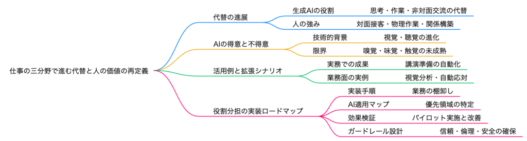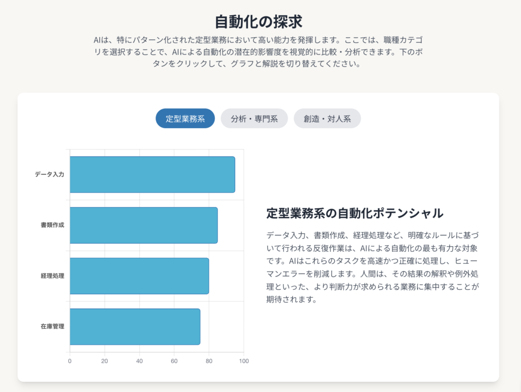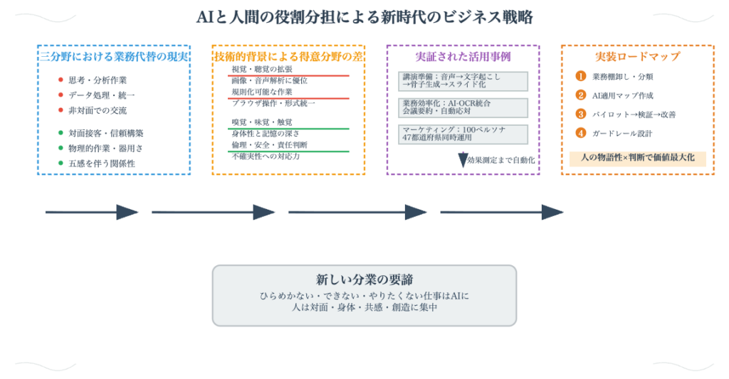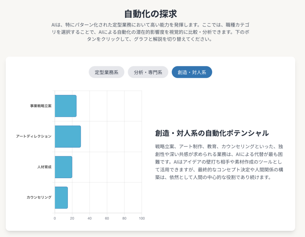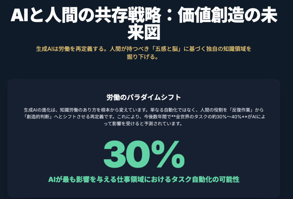 企業は、AIによる代替の経済的メリット(生産性向上、競争力強化)を最大限に享受しつつ 1、代替が困難な「非定型・身体化された知識」が必須の領域に人的資源を戦略的に再配置することが求められます。これには、従業員に対し、創造性、共感力、複雑な判断力を育成するための再教育投資と、組織全体の抜本的な業務プロセス改革が不可欠です。