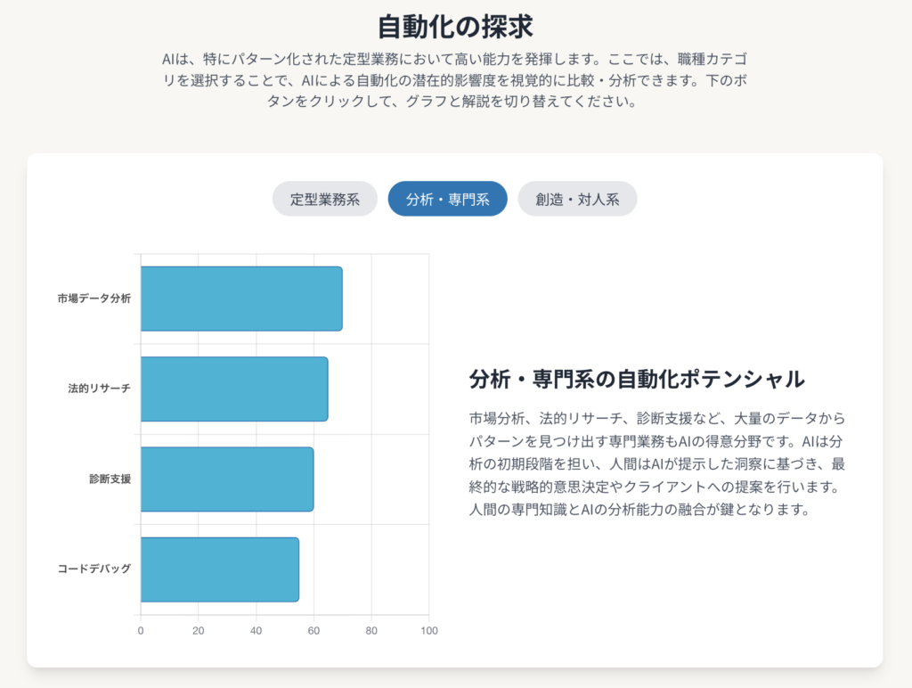 特に注目すべきは、かつて専門性が高く、高度な知識を必要とした「通関士」や「会計監査」といった職種が代替の対象とされている点です 1。この事実は、AIが高度な専門知識そのものの「検索・適用」は極めて得意であることを示しています。AIは、複雑な法規や会計基準を迅速に参照し、定型的な手順に従って処理を実行することができます。したがって、これらの職種において市場価値を失うのは、専門知識の「非定型的な創造・判断」ではなく、専門知識の「定型的な適用」の部分であると特定されます。