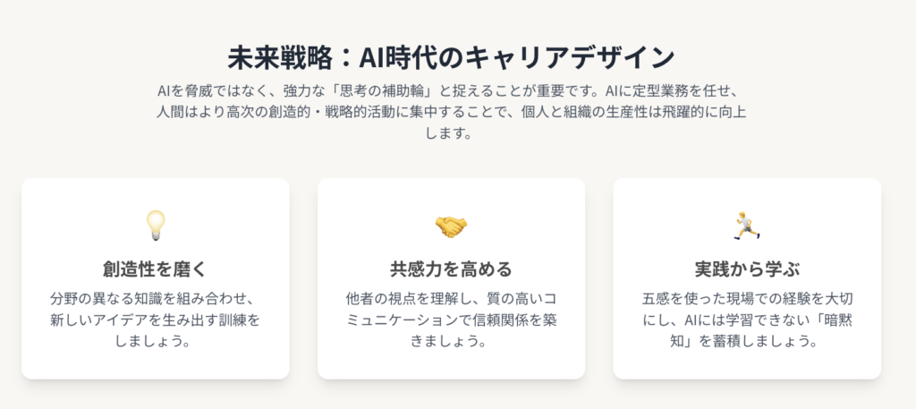 AIと競争するのではなく、AIと共存しながら自身の市場価値を高めるキャリア戦略が必須となります 12。AIが得意とする定型的な作業や情報処理が自動化される中、人間にしかできないとされる能力が相対的に重要性を増します。具体的には、前述の不可代替領域に関連する、創造性、共感力、および複雑な判断力を活かしたキャリアパスが重要となります 2。