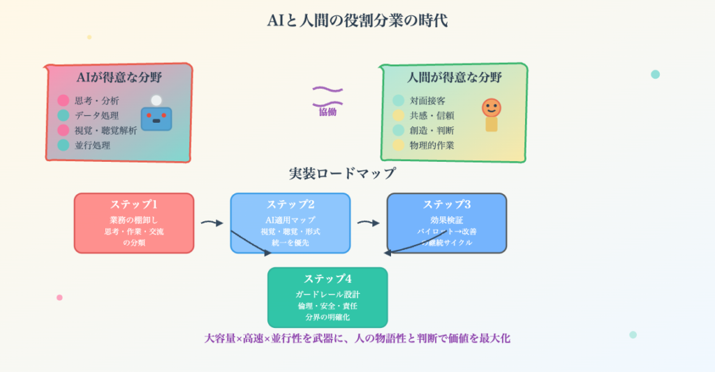 医療や介護の分野では、AI搭載の介護ロボットや診断支援システムが導入され、人材不足を解消する事例が増えています 1。この事実は、AIが「重労働やデータ処理」という代替可能な部分を担う一方で、人間は「共感・ケア」という代替できないコアな部分に集中するという、AIと人間の理想的な協働体制が成功していることを示しています 1。