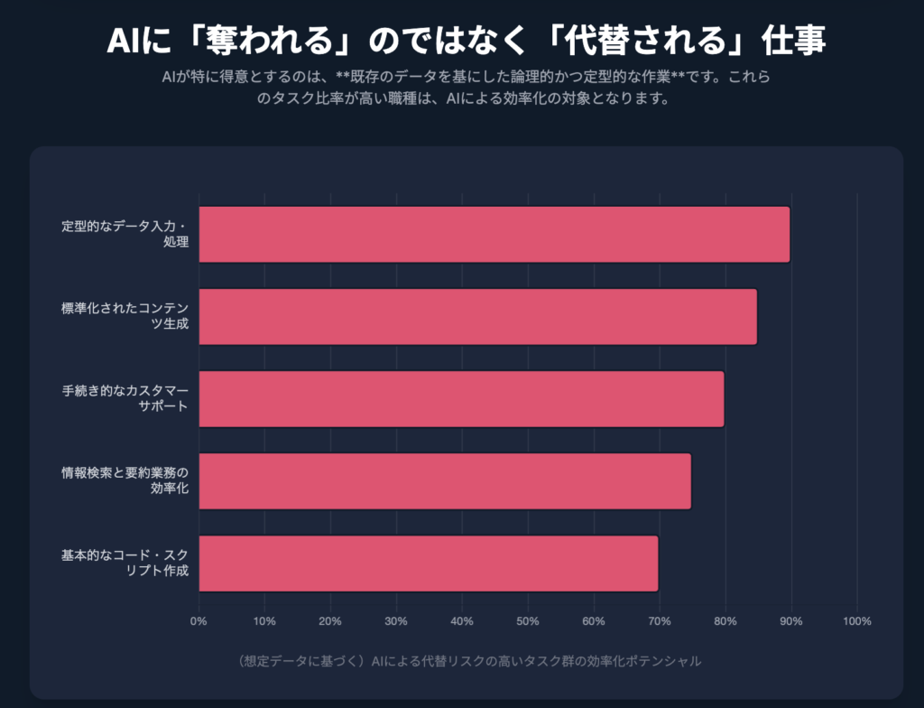 代替されやすい業務の特徴 | 具体的な職種・タスク例 | AIによる自動化メカニズム | 引用元 |