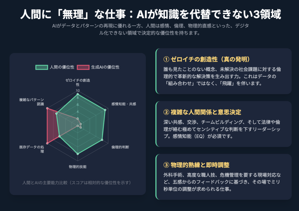 AIが人間の知識や役割を代替できない領域は、セクションIIIで詳述した「身体化認知の欠如」と、人間特有の「非定型な思考」 2 が要求される場面に集約されます。