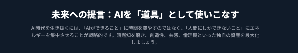代替される仕事リストに「ライター」が含まれる一方で 2、AI時代に価値が高まる仕事として「0→1を生み出す創造性」が挙げられる 2 のは、この区別が存在するためです。AIは情報伝達のための機能的コンテンツを代替できますが、人間の情動や文化に訴えかける本質的な創作は、人間の主観的な価値観と哲学的洞察に依存します。