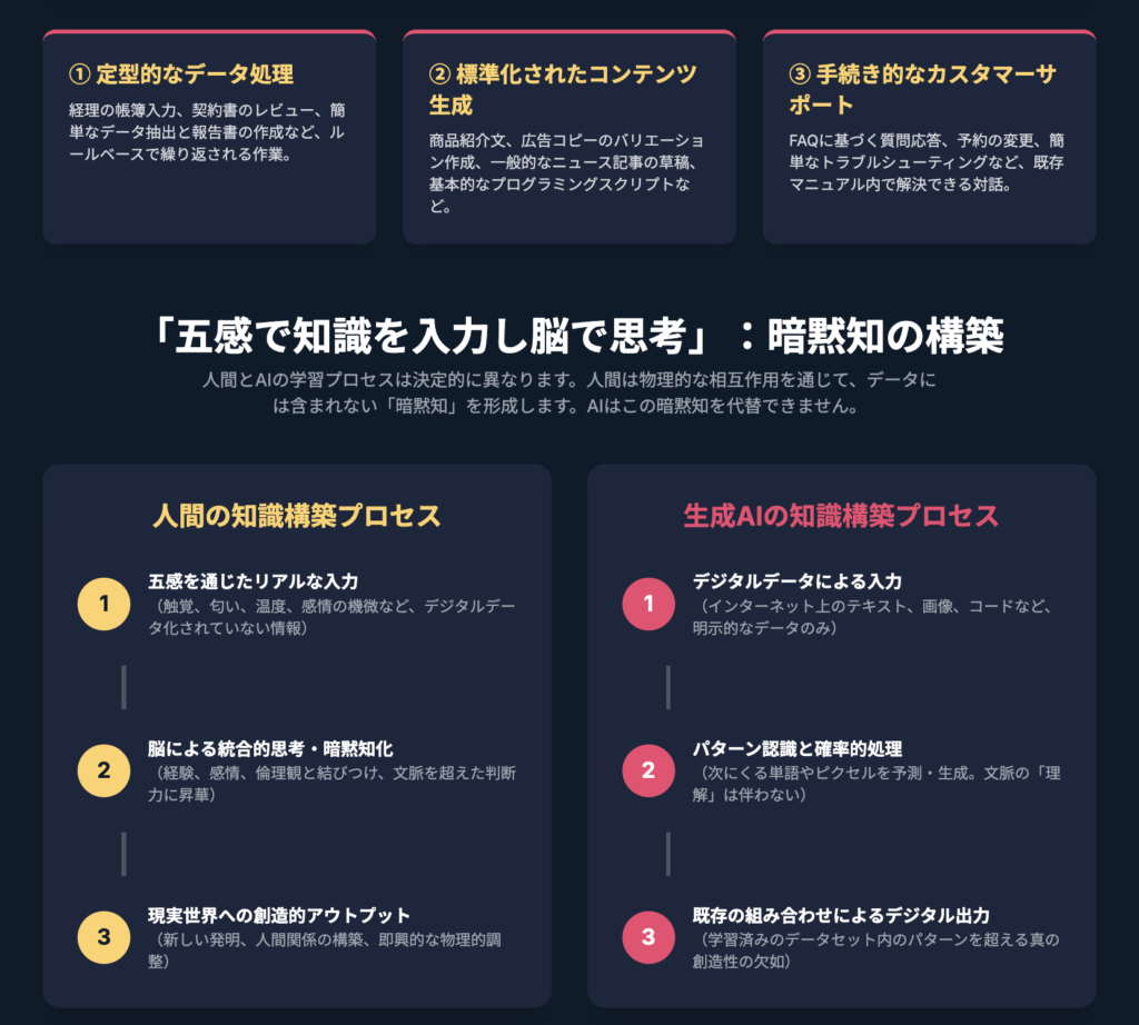 状況に応じた複雑な価値判断、洞察力 | 非定型的な思考、直感、経験知 (Tacit Knowledge) 2 | データ内の相関関係の学習は得意だが、データに存在しない新しい概念や倫理的葛藤への対応が困難 2 | 真の$0 \to 1$を生み出す創造性 |