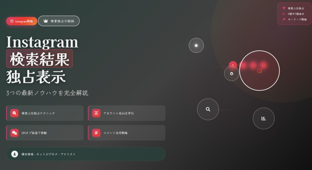 本日は、Instagram運用における最新の3つの重要なトピックについて、詳細な解説を行わせていただきました。第一に、アカウント名の文字数が64文字へと拡張されたことにより、検索最適化において新たな可能性が開かれました。多くのキーワードを戦略的に配置することが可能となった一方で、視覚的な美しさとのバランスについても慎重に考慮する必要がございます。第二に、DMタブが画面下部に移行し、スワイプ機能が追加されたことは、ユーザー体験の向上を目指したInstagramの継続的な進化を示しております。特にディープメディア時代においては、クローズドなコミュニケーションの重要性が増大しており、この変更はまさにその時代的要請を反映したものと言えるでしょう。第三に、本日最も衝撃的であったのは、検索結果を独占表示している「COCOマーケ」の戦略的手法の発見でした。複数のインフルエンサーアカウントを効果的に活用し、さらにコメント欄にまで戦略的にキーワードを配置するという手法は、私たちにとって極めて貴重な学びの機会を提供してくれます。これらの知見を詳細に分析し、自社のInstagram運用戦略に適切に活用していくことによって、より効果的な集客活動が実現可能となるはずです。ぜひ、本日ご紹介した内容を実践に移していただき、成果を上げていただければと思います。ネットビジネス・アナリスト横田秀珠でした。本日も最後までご視聴いただき、誠にありがとうございました。