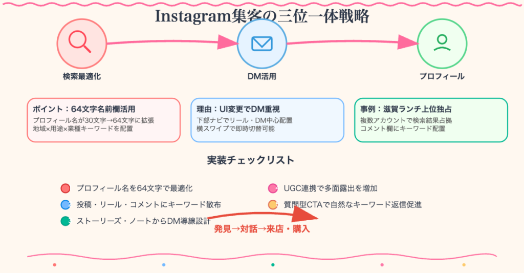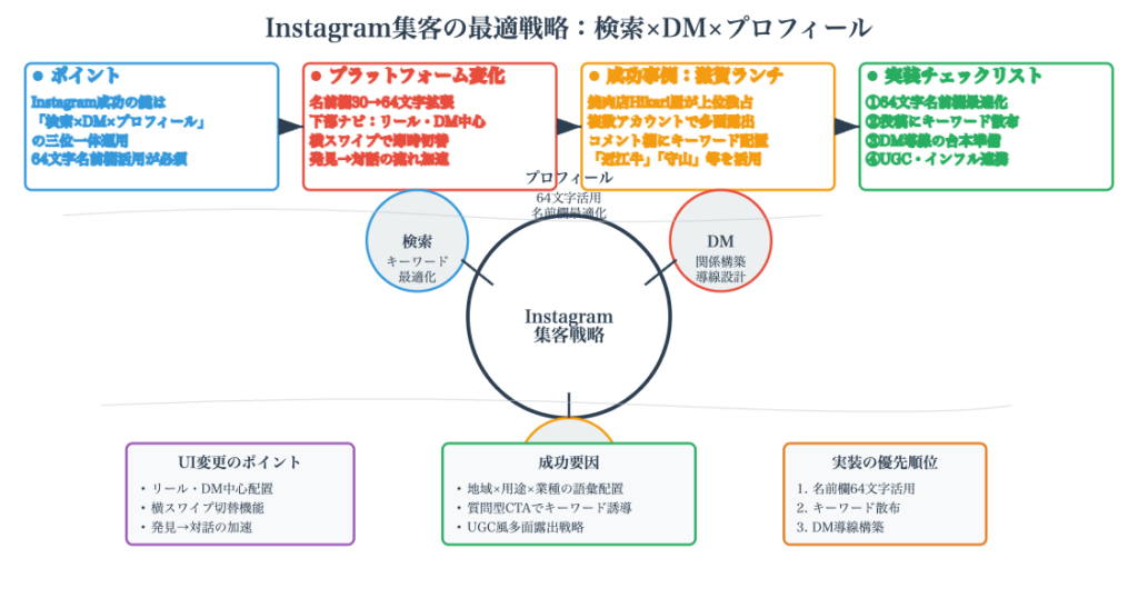 📊 検索最適化 Instagramの検索アルゴリズムを理解し、上位表示を実現する技術です。アカウント名へのキーワード挿入、投稿内容の最適化、コメント欄の活用、複数アカウント展開など、多角的なアプローチが重要です。フォロワー数だけでなく、戦略的なコンテンツ設計により、検索結果での優位性を確保できることが実証されています。