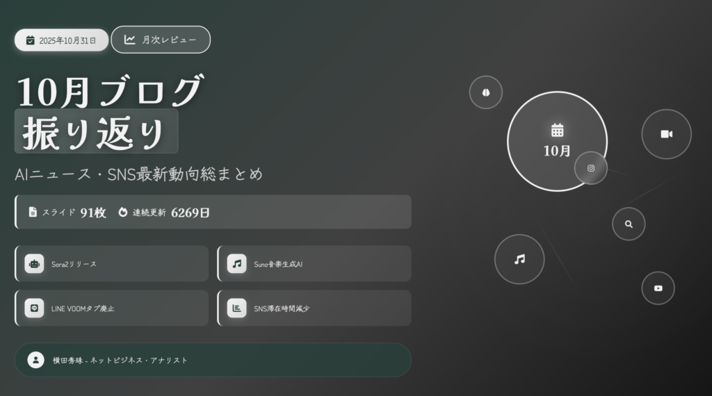 ネットビジネス・アナリスト横田秀珠氏による2025年10月末のブログ振り返り配信。6269日連続更新を達成し、今月の人気記事ランキングを紹介。LINE VOOMタブ廃止、音楽生成AI「Suno」のSNS化、動画生成AI「Sora2」登場、生成AI台頭によるSNS滞在時間減少とAI記事の増加など、最新のネットビジネス・SNS・AI関連ニュースを解説。長岡造形大学での情報リテラシー論授業の内容も共有し、91枚のスライドを公開した。