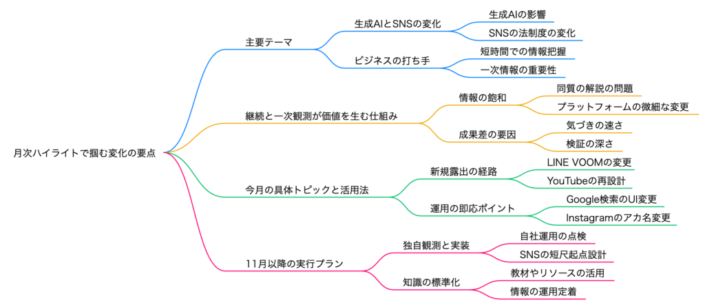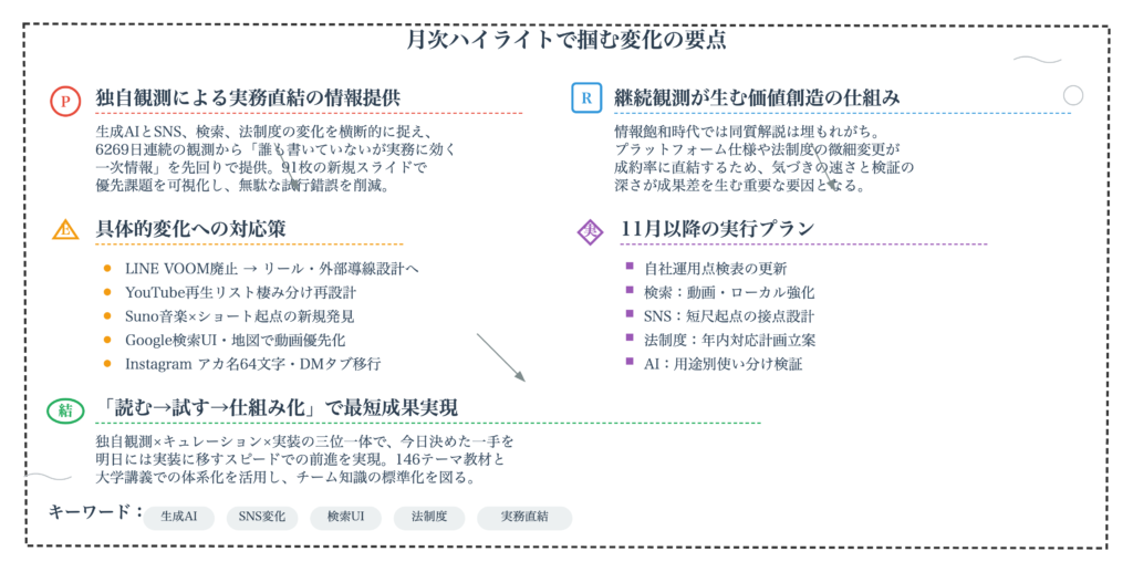 今月は特に、LINE VOOMの機能縮小、YouTubeの新機能追加、音楽生成AIの進化、そして生成AIがSNS滞在時間に与える影響など、ネットビジネスの大きな転換点となるニュースが相次ぎました。特に注目すべきは、生成AIの台頭によってSNSの滞在時間が減少している一方で、AIが作成した記事が全体の半分を占めるようになったという事実です。しかし、SEOで上位表示されるのは依然として人間が作成したコンテンツが優位であるという興味深い現象も観察されています。