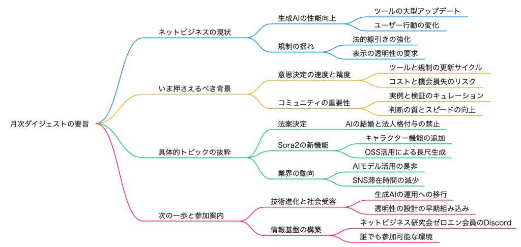 ネットビジネス・アナリスト横田秀珠による2025年10月のネットビジネスニュース振り返り。Discord無料コミュニティ「ゼロエン会員」(145名参加)で共有された情報をまとめた内容。Sora2やGrokなどの生成AI動画・画像技術の進化、AIの法人格禁止法案、中国製ヒューマノイド20万円、Affinity無料化、noteがアメブロを逆転などのトピックを紹介。AI電力消費による電気代高騰やSNS滞在時間減少などマーケティングに関する話題も取り上げている。