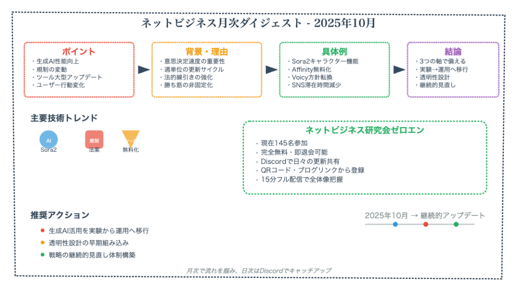 2025年10月は、まさにAI技術の進化とネットビジネスの変革が交差する歴史的な転換点となった1か月でありました。Sora2やVeo3.1などの動画生成AIの飛躍的な進化、Affinityの無料化というデザイン業界を揺るがす大ニュース、そしてnoteがアメブロを逆転するという歴史的瞬間まで、私たちの目の前で業界地図が書き換えられていく様子を目撃することができました。