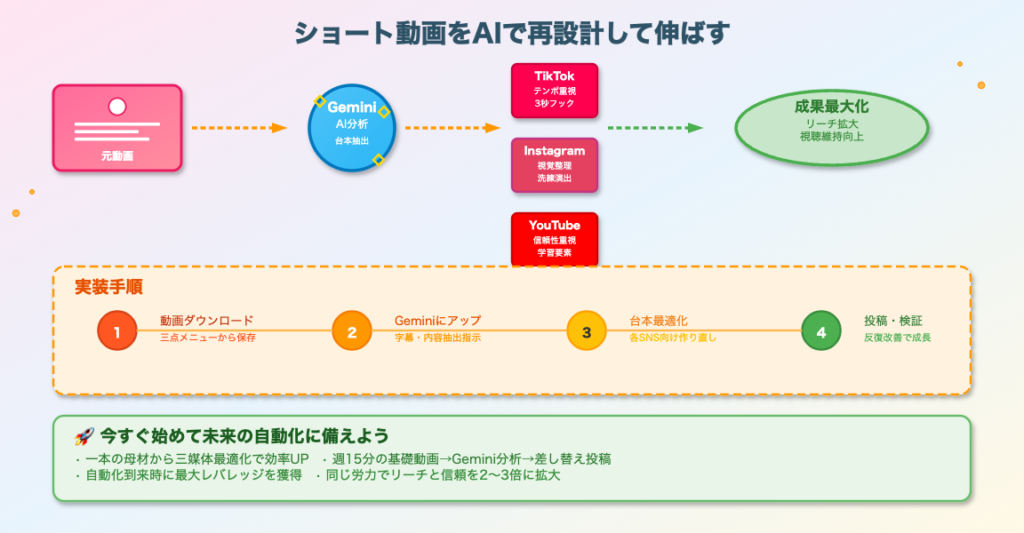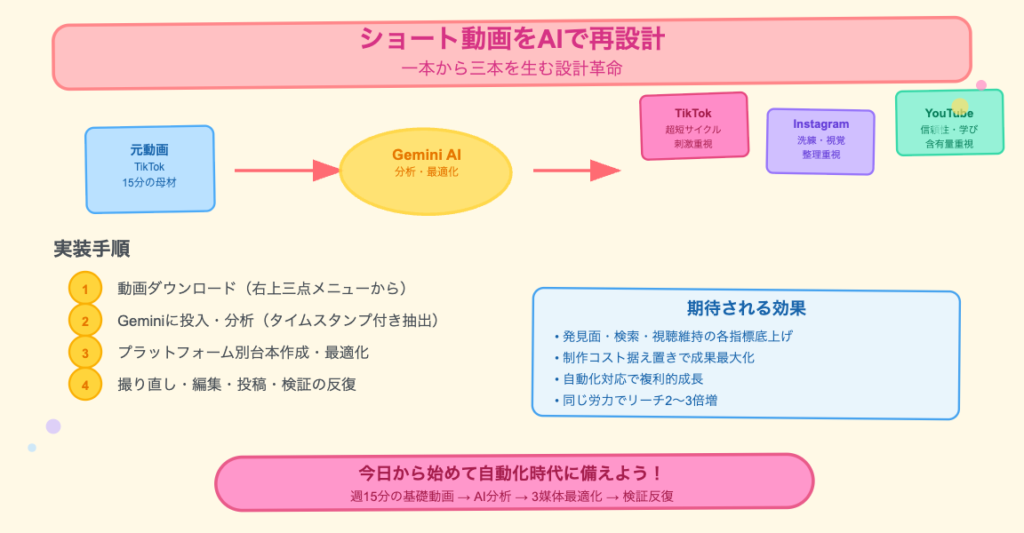 本記事では、TikTok動画をGoogleのGeminiを使用して詳細に分析し、その結果をTikTok、Instagram、YouTubeという3大SNSプラットフォームそれぞれに最適化されたコンテンツへと変換する、革新的な手法について詳しく解説してきました。動画ファイルをダウンロードし、AIに入力するだけで、タイムスタンプ付きの詳細な分析レポートが生成され、さらにそれを各プラットフォームの特性に合わせたシナリオへと作り替えることができるという、この技術の可能性は計り知れません。