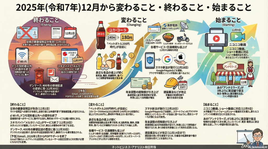 本記事では、ネットビジネスアナリストとして日々ニュースを収集・分析している立場から、2025年12月に変わること・始まることを網羅的にお伝えします。値上げ情報からサービス終了のお知らせ、そして来年以降に向けた注意点まで、分かりやすくまとめましたので、ぜひ最後までお読みいただき、年末年始の準備にお役立てください。