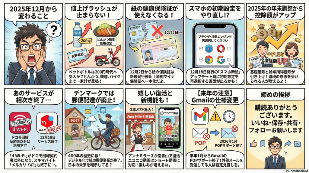 2025年12月から日本で様々な変化が起こる。値上げではペットボトル飲料が200円時代に突入しつつあり、長野電鉄やスカパーJSATなども値上げを実施。12月2日から従来の健康保険証が使えなくなりマイナ保険証への移行が進む。12月18日にはスマホ新法が施行され、ブラウザや検索エンジンの選択が必須に。また、ニコニコ動画がショート動画に対応、メルカリ ハロは終了。デンマークでは400年続いた郵便配達が終了という衝撃のニュースも。2026年にはGmailのPOPサポート終了が控えており、注意が必要だ。