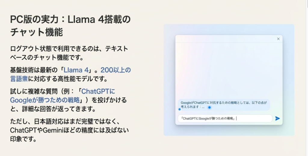 「ChatGPTやGoogle Geminiほど賢いかというとそうではないし、日本語対応もまだ完璧ではないので、実用的に使うかと言われると難しい部分があります」