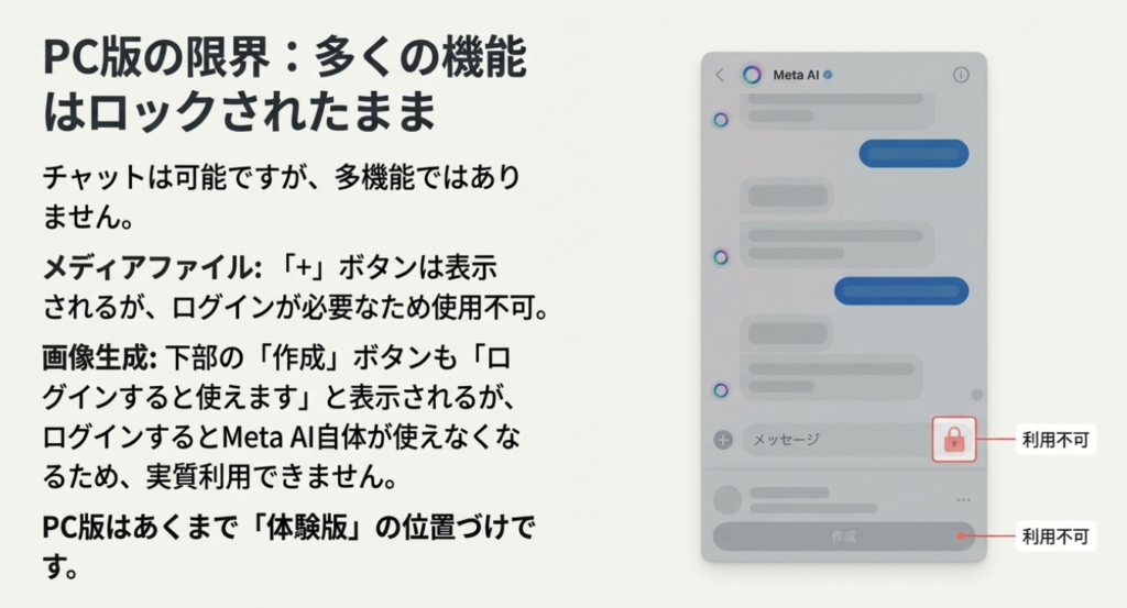 下部に「作成」というボタンがあるので押してみると、「Meta AIの情報をもっと見る」「ログインすると使えます」と表示されます。しかし、ログインすると使えないので、これもできません。基本的にはチャットのやり取りしかできないということです。