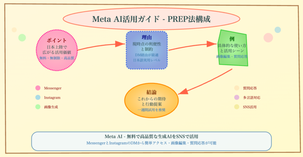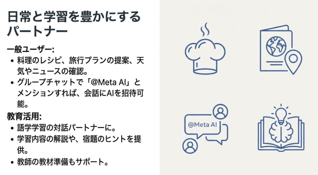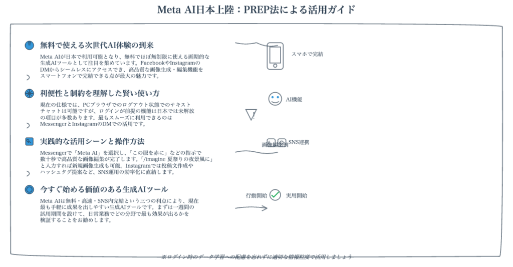 Metaの戦略は、AIを一部の専門家が使う特別なツールではなく、誰もが日常的に利用するコミュニケーションとコンテンツ制作の「便利なアシスタント」として定着させることを目指している。次のセクションでは、この戦略がなぜ成功する可能性を秘めているのか、その具体的な強みを詳述する。