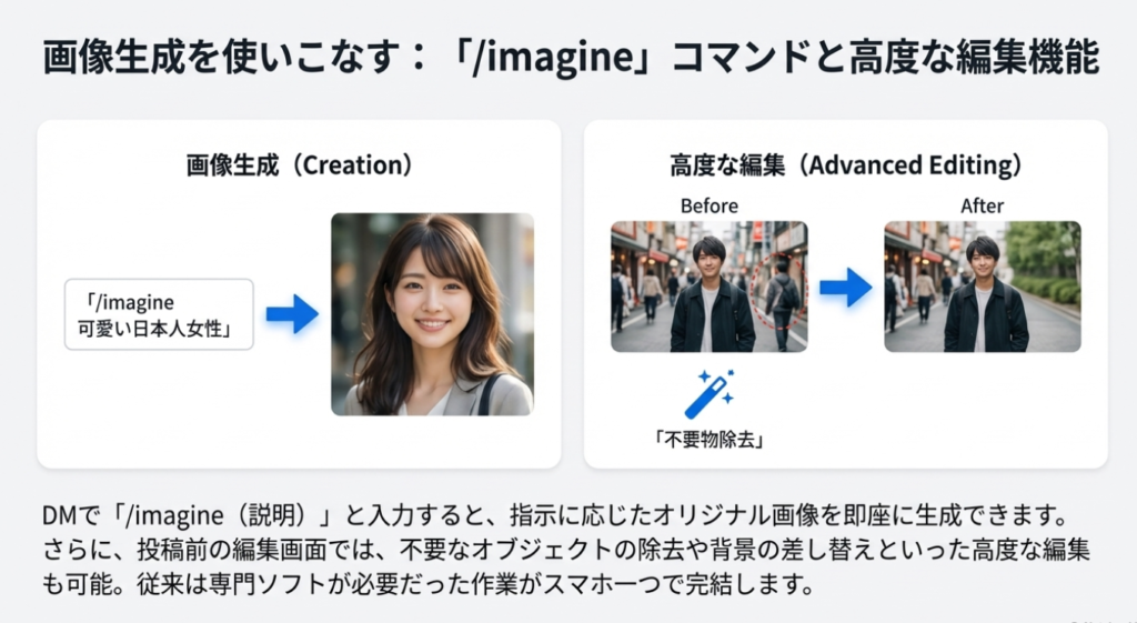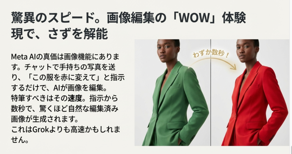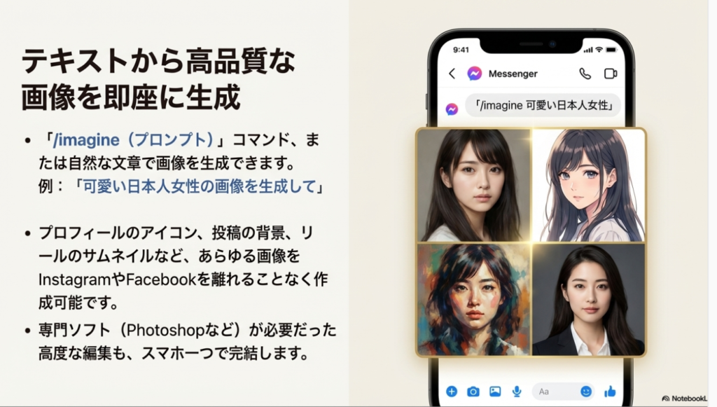 特にビジュアルコミュニケーションが中心となるSNSプラットフォームにおいて、Meta AIの画像関連機能は極めて強力な武器だ。Messenger上では、ユーザーが送信した写真に対して「この服を赤に変えて」といった自然言語で指示するだけで、瞬時に画像を編集できる。また、「/imagine」コマンドを使えば、テキストの指示から全く新しい画像を生成することも可能だ。