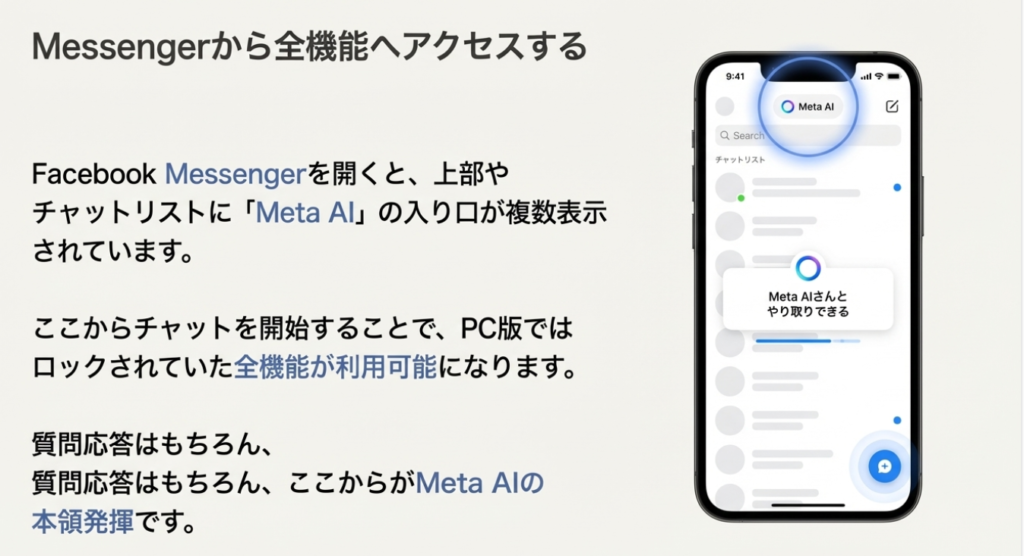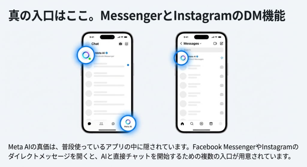 ◦ ユーザーは、特別な操作をすることなく、MessengerやInstagramのダイレクトメッセージ(DM)画面から直接Meta AIを呼び出すことができる。ソースコンテキストが示すように、Messengerアプリでは画面の上部、中央、右下など「どこからでもアクセスでき」、InstagramでもDM画面の上部に常にMeta AIが存在する。これにより、友人とのチャットの延長線上で、あるいはインスピレーションが湧いたその瞬間に、思考を中断することなくAIのサポートを得ることが可能になる。
