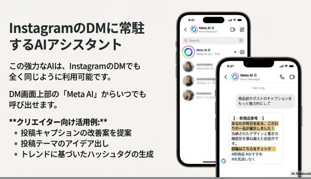 ◦ InstagramのDM内では、Meta AIが強力なクリエイティブ・アシスタントとして機能する。例えば、「商品紹介ポストのキャプションをもっと魅力的にして」と依頼すれば洗練された文章を提案し、「〇〇というテーマで投稿ネタを考えて」と問いかければトレンドを踏まえた企画案を提示してくれる。ハッシュタグの候補生成や投稿文のドラフト作成など、これまでChatGPTのような外部ツールに切り替えて行っていた作業を、すべてアプリ内で完結できる利便性は計り知れない。