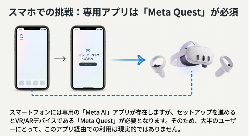 • スマホ専用アプリ: Meta Quest(VR/MRヘッドセット)を所有していないとセットアップできず、事実上利用できない。