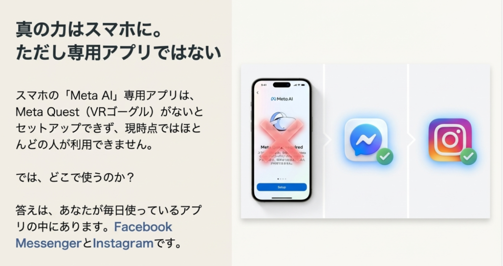 A3. スマートフォンでMeta AIを利用する最も簡単な方法は、Facebook MessengerまたはInstagramのDM(ダイレクトメッセージ)機能を使うことです。Messengerを開くと「Meta AI」という表示が出ており、そこからアクセスできます。Instagramの場合は、DMページの上部にMeta AIが表示されています。なお、スマホ専用のMeta AIアプリは、現時点ではMeta Questが必要なため一般的には使用できません。