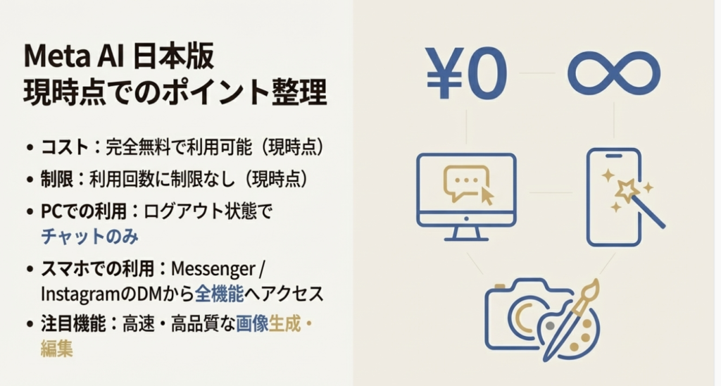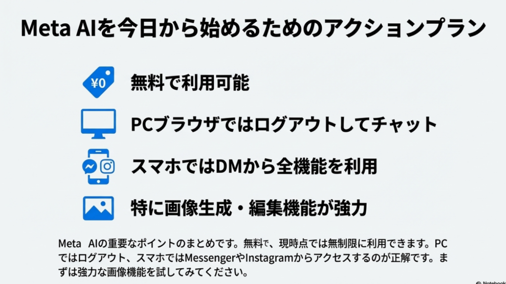 Meta AIは無料で利用でき、現時点では利用制限もありません。ただし、ログイン状態で利用するとデータが学習に使われる可能性があるため、個人情報の取り扱いには注意が必要です。今後のアップデートにも注目しながら、ぜひ皆さんもMeta AIを試してみてください。