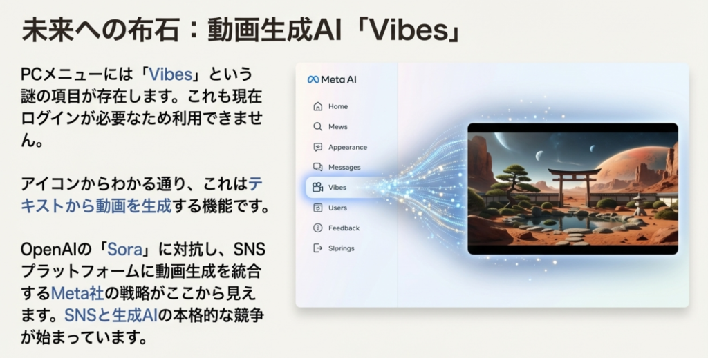 本記事では、Meta AIの日本国内サービス開始に伴い、PCブラウザやスマートフォンからの具体的な利用方法、注目の動画生成機能「Vibes」、そして画像生成・編集機能まで、徹底的に解説していきます。AIに詳しくない方でも安心して読み進められるよう、一つひとつ丁寧にご説明しますので、ぜひ最後までお付き合いください。