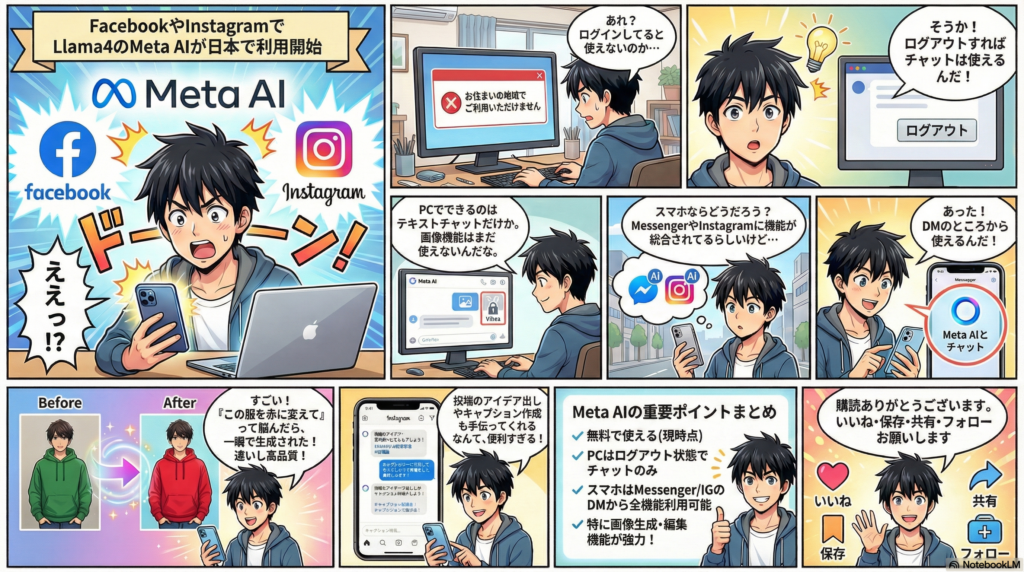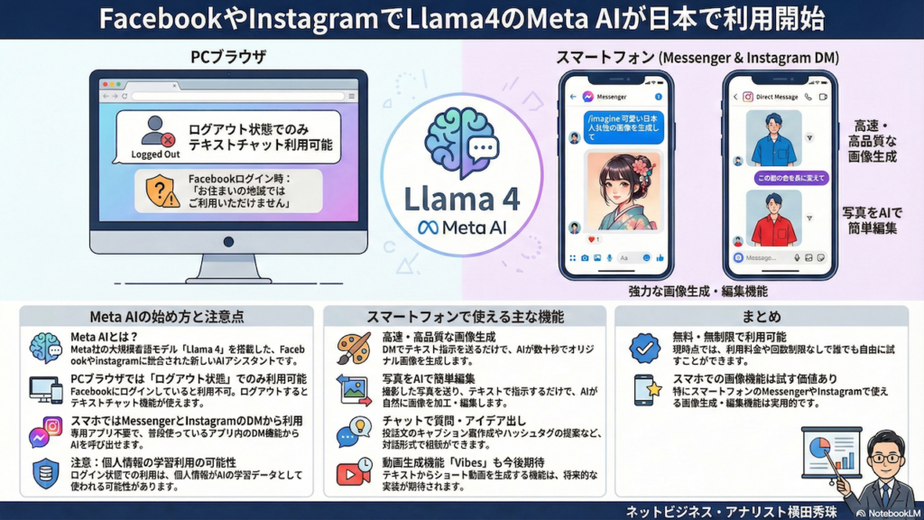 Meta AIが日本国内で利用開始となりました。PCブラウザではログアウト状態でチャット機能が使用可能ですが、ログイン時や一部機能は利用不可です。スマホではFacebook MessengerやInstagramのDMからアクセスでき、画像生成・編集機能が高品質かつ高速で利用できます。動画生成機能「Vibes」は現時点で日本未対応。基盤技術はLlama 4で、ChatGPTやGeminiほどではないものの実用的な性能を持ち、無料・無制限で利用可能です。