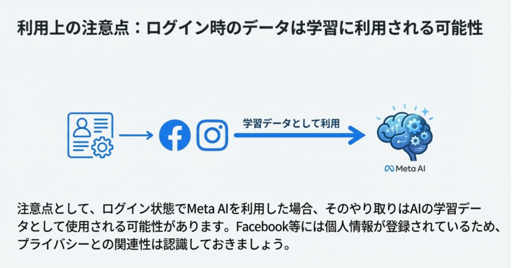Meta AIをログイン状態で使用すると、入力データが学習に利用される可能性があります。FacebookやInstagramに登録された個人情報と紐づいているため、利用時は注意が必要です。PCブラウザではログアウト状態での利用が推奨されており、個人情報保護の観点から使い分けが重要です。