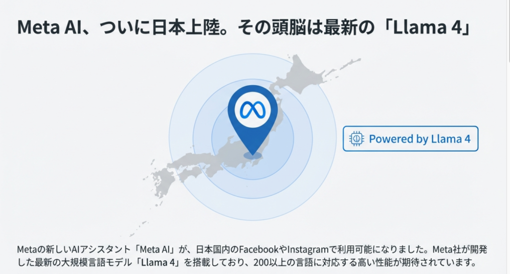 ChatGPTやGoogle Geminiなど、AIアシスタントが急速に普及する中、Meta社もついに日本国内向けにAIサービスを展開し始めました。これまでAIを使うためには専用のサービスやアプリにアクセスする必要がありましたが、Meta AIは私たちが日常的に使っているFacebookやInstagramの中で直接利用できるという大きな特徴があります。