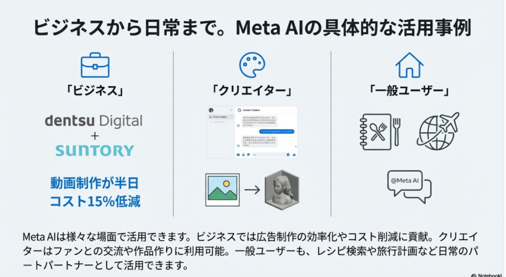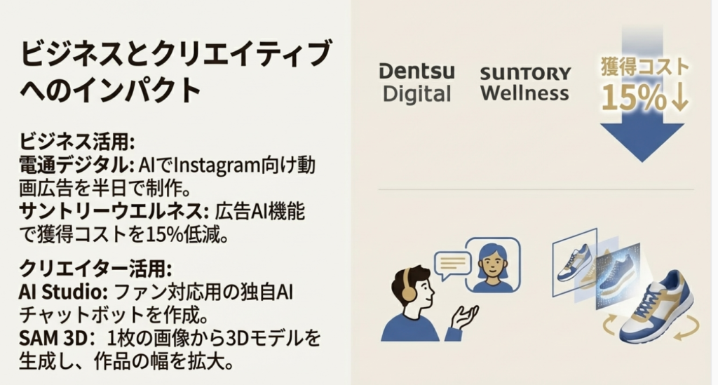 • ビジネス活用: 電通デジタルはMeta AIを活用してInstagram向けの縦型動画広告を最短半日で制作するソリューションを開発。また、サントリーウエルネスはMetaの広告AI機能を導入し、顧客獲得コストを約15%低減させる成果を上げている。