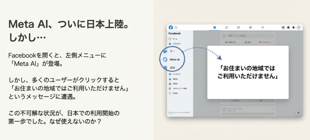 まず、11月25日の発表から少し遅くなってしまった理由についてお話しします。Facebookを開いた時に、左のメニューに「Meta AI」という項目が出るようになりました。クリックするとページが表示されるのですが、「お住まいの地域でご利用いただけません」と表示されるのです。