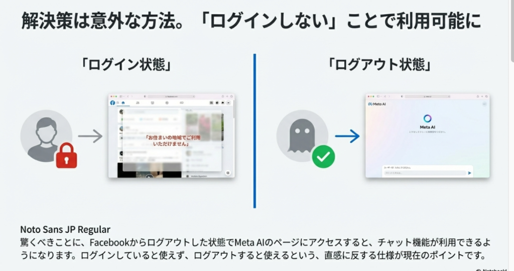 Q2. PCブラウザでMeta AIが「お住まいの地域でご利用いただけません」と表示されます。どうすれば使えますか?