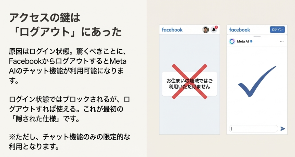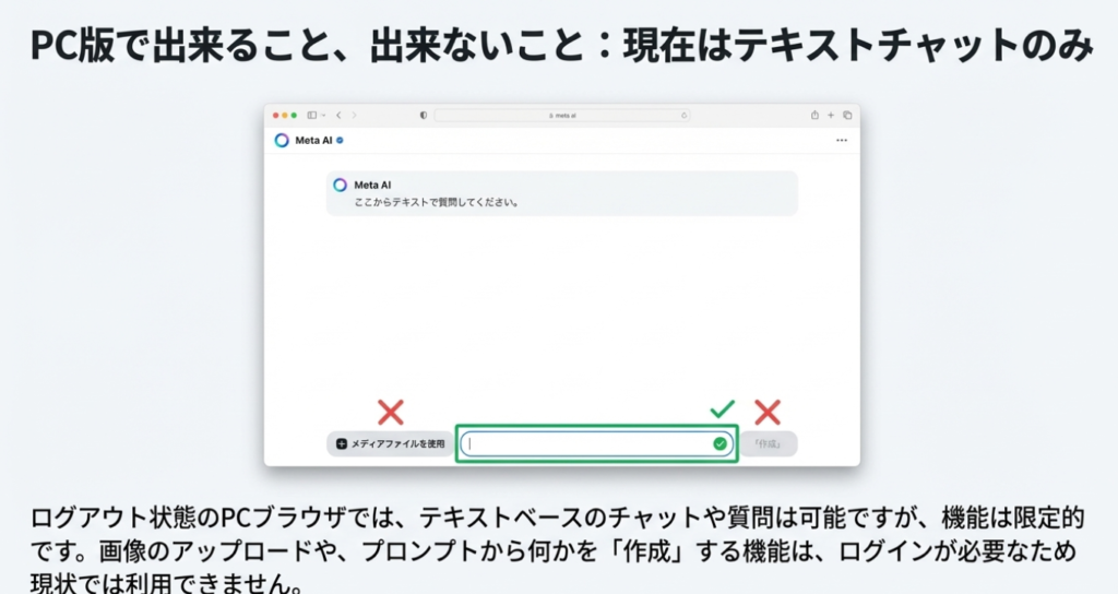 A2. この問題は、Facebookにログインした状態で発生することがあります。解決方法として、一度Facebookからログアウトしてからmeta.aiにアクセスしてみてください。ログアウト状態であれば、チャット機能を利用することができます。ただし、メディアファイルの添付など一部機能はログインが必要なため、現状では使用できません。