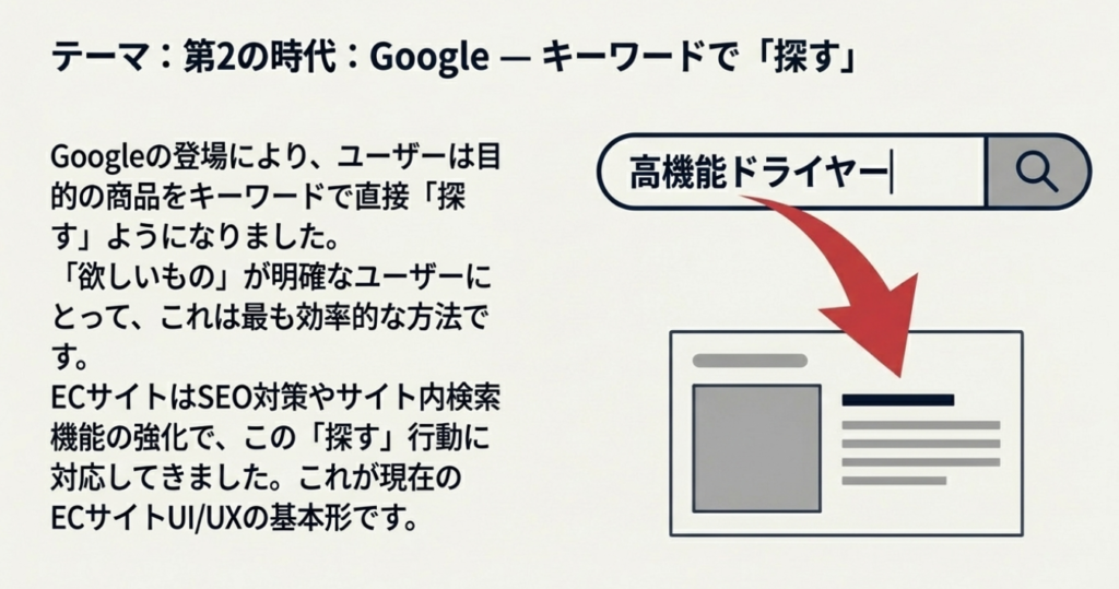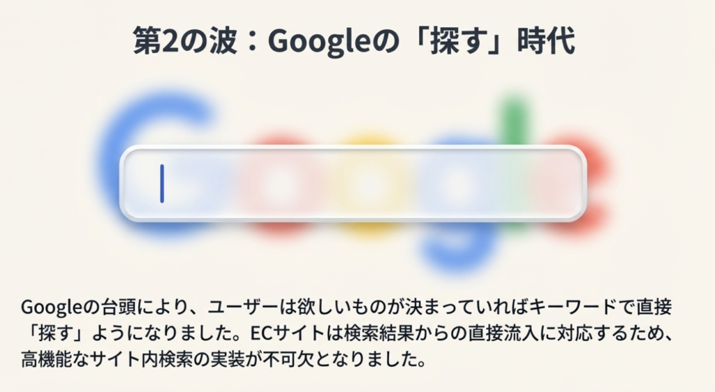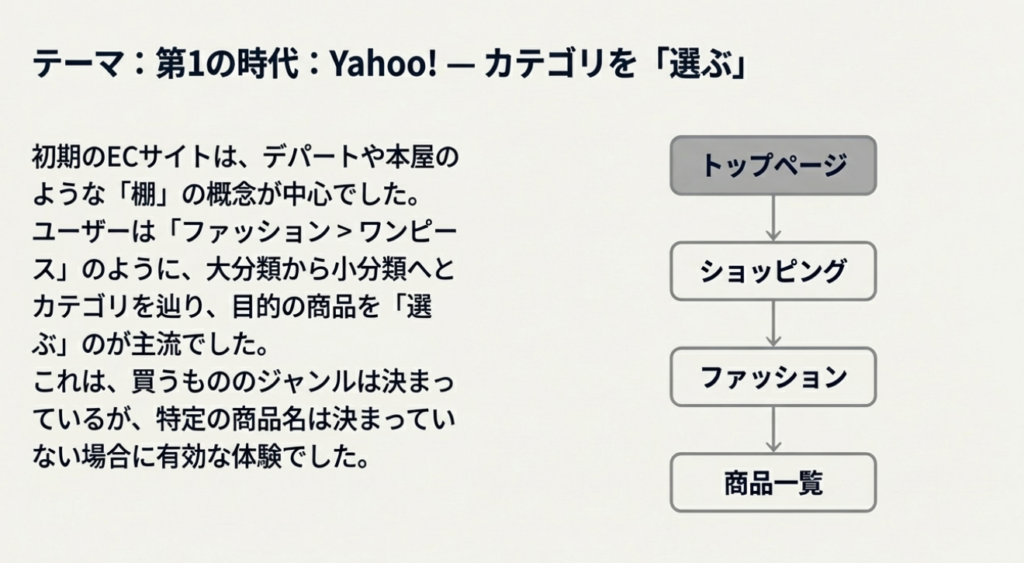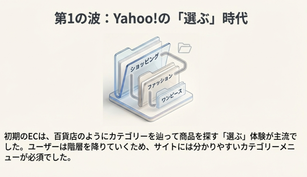巨大なオンラインショッピングモールを訪れ、「選択肢が多すぎて、結局何を買えばいいのか分からない…」と途方に暮れた経験はないでしょうか。私たちの買い物の仕方は、テクノロジーと共に進化を続けてきました。かつてはYahoo!のようなポータルサイトでカテゴリを「選ぶ」のが主流でした。次にGoogleの登場で、欲しいものをキーワードで「探す」時代が到来しました。