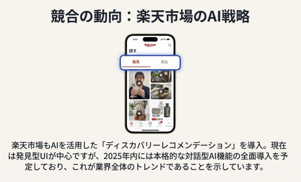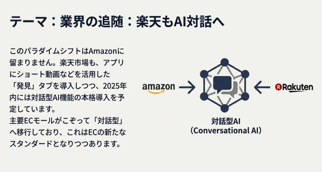 AmazonがAI相談で成功を収め、これが「当たり前の体験」になると、ユーザーは他のECサイトにも同様の機能を期待するようになります。このトレンドはすでに始まっており、楽天市場は2025年内に対話型AI機能の導入を予定しています。