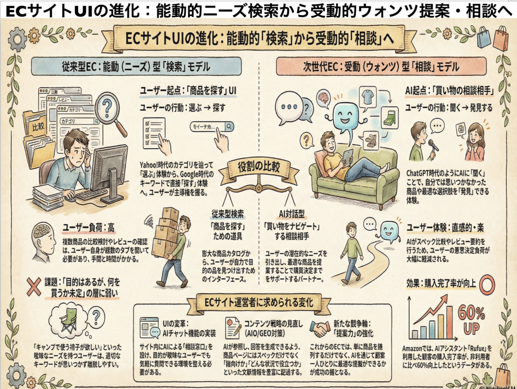 • 買い方の進化: 私たちの商品探しは、キーワードを打ち込む「検索」から、AIに目的や悩みを伝える「相談」へとシフトしています。これは、ECサイトとの関係が商品を取引するだけの関係から、信頼に基づくパートナーへと変わることを意味します。