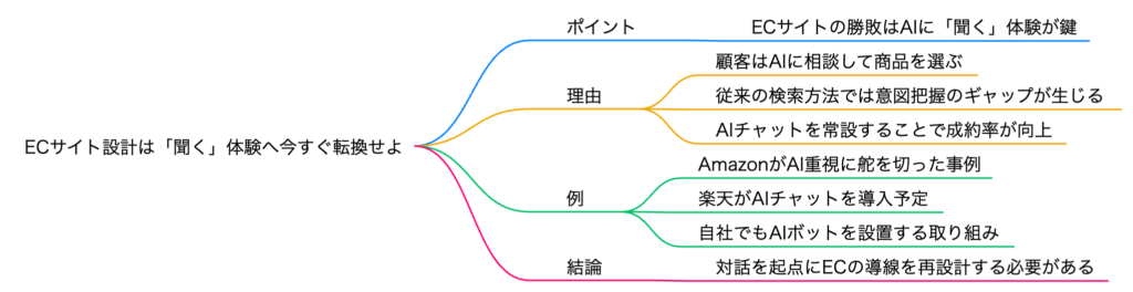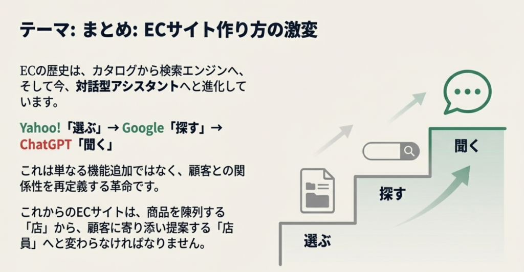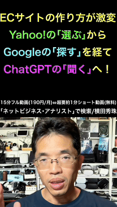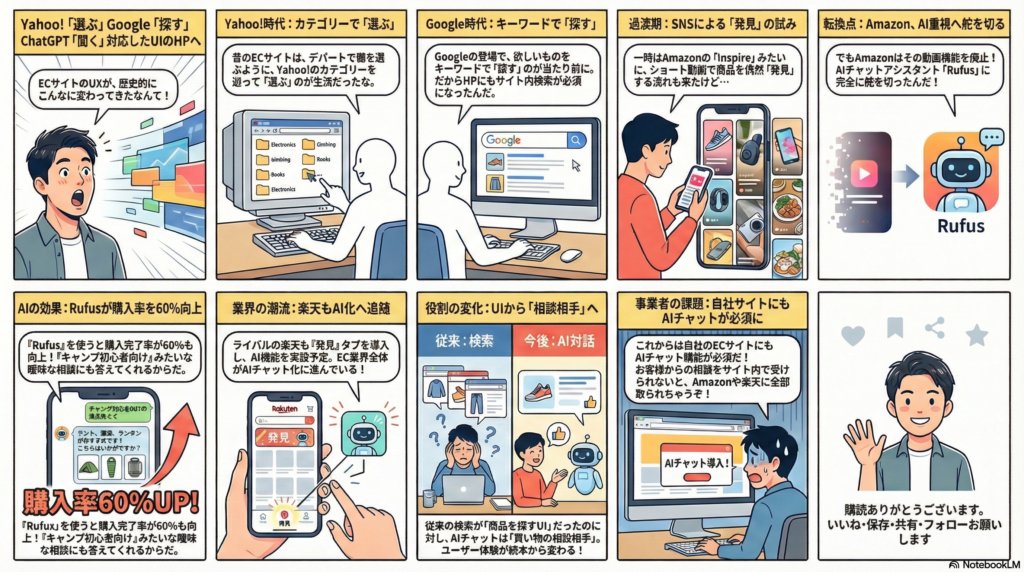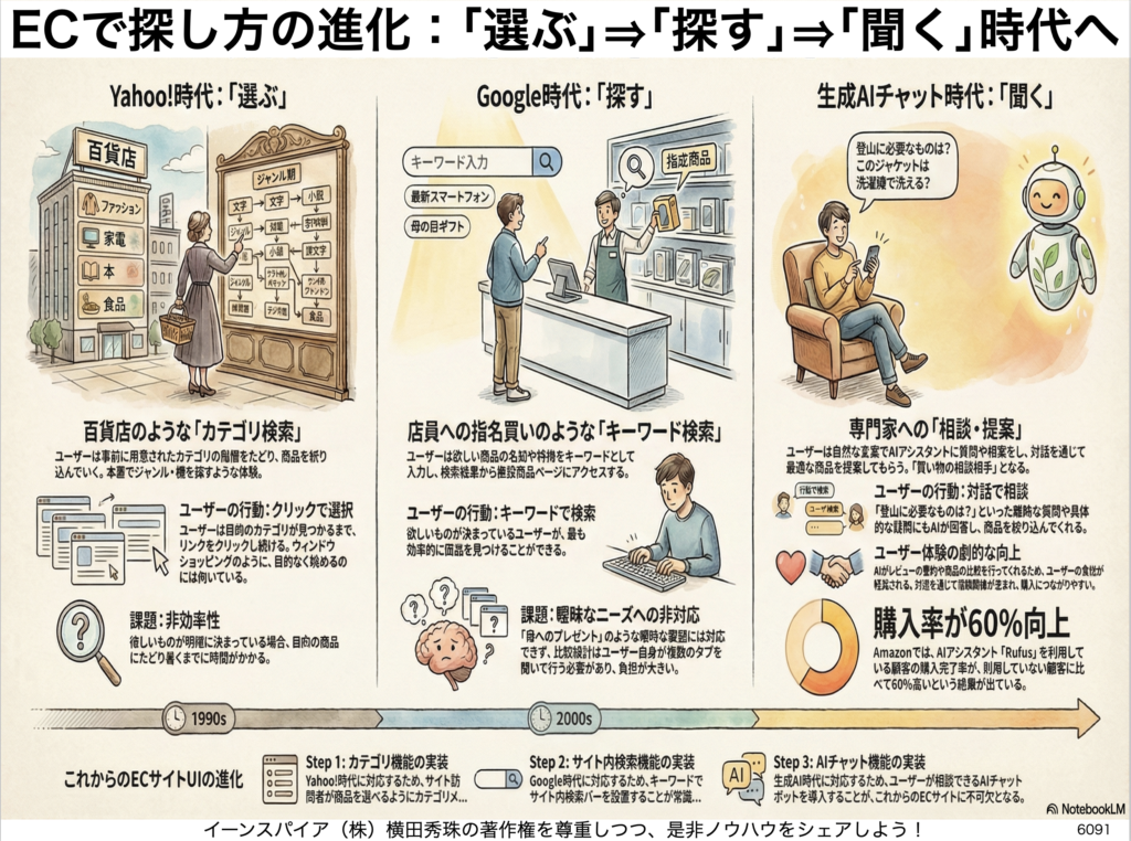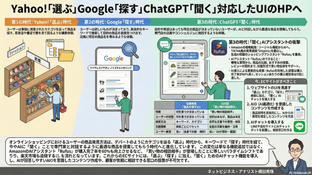 ECサイトの作り方が大きく変わろうとしている。Yahoo時代はカテゴリーから「選ぶ」、Google時代はキーワードで「探す」が主流だったが、ChatGPT時代はAIに「聞く」へと移行する。AmazonのRufusは購入率60%向上を実現し、楽天も発見タブを導入した。今後のECサイトには生成AIチャット機能が必須となり、目的が決まっていない顧客とも対話しながら買い物に誘導できるようになる。LINE公式アカウントのAIチャットボット導入が第一歩となる。
