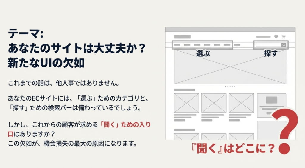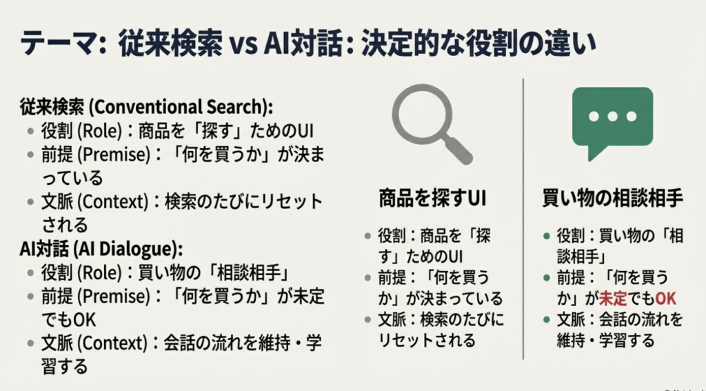 | ユーザーの出発点 | 買うものが決まっている(商品を探すUI) | 目的や用途だけ決まっている(買い物の相談相手) |