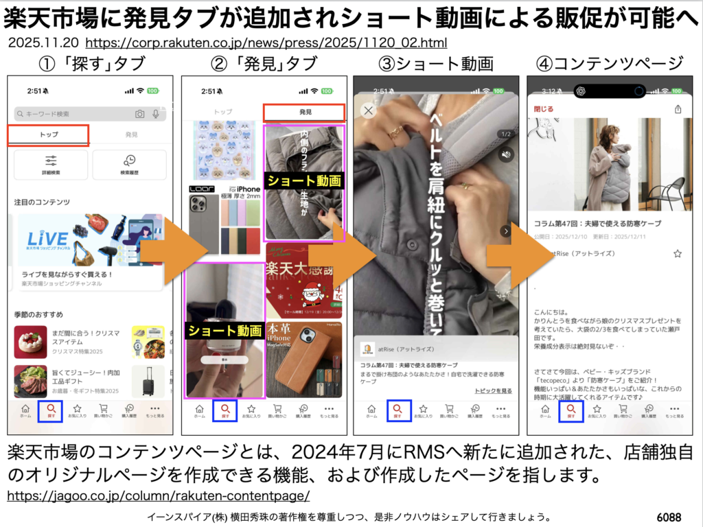 📱 楽天の発見タブ 楽天の発見タブとは、2025年11月に楽天市場アプリに追加された新機能です。ショート動画やバナー広告を通じて、ユーザーが新しい商品を「発見」できる仕組みです。2025年内にはAIチャット機能も実装予定と発表されています。
