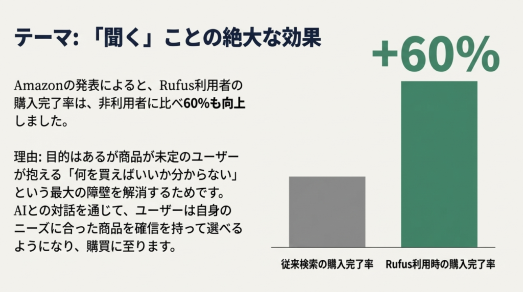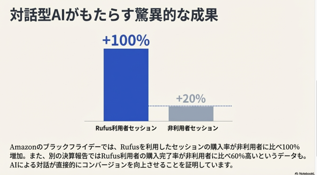 この戦略転換は、すでに具体的な成果として表れています。Amazonの発表によると、AIアシスタント「Rufus」を利用している顧客の購入完了率は、利用していない顧客に比べて60%も高くなりました。
