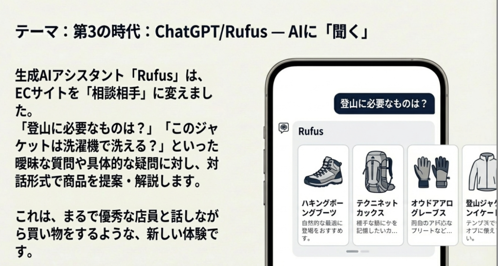 そして今、私たちは新たな変革の入り口に立っています。それは、AIに自然な言葉で「聞く(相談する)」という、全く新しい買い物スタイルです。