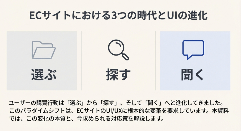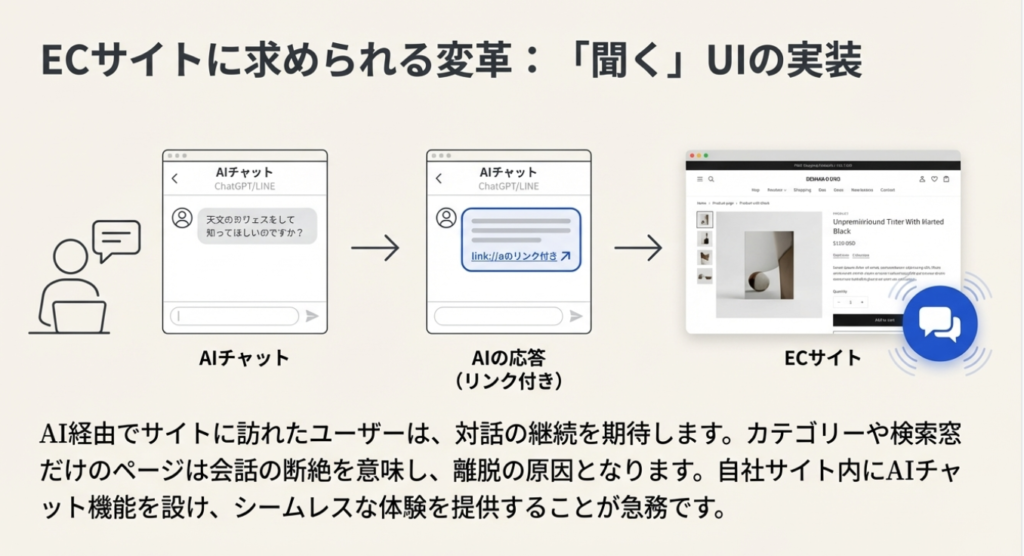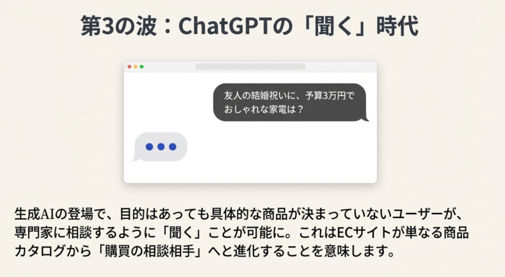 そして今、私たちは新たな転換点を迎えています。それが「AIに聞く」時代の到来です。ChatGPTをはじめとする生成AIの登場により、まるで店員さんに相談するかのように、AIとチャットしながら買い物ができるようになりつつあります。この変化は、ECサイトの在り方そのものを根底から覆す可能性を秘めています。