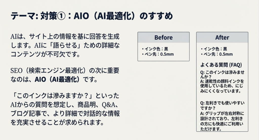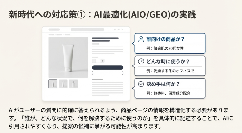 そして、この変化はビジネスの現場にも大きな影響を与えます。事業者にとって、これは従来のSEO(検索エンジン最適化)から、AIが自社の商品を理解し、的確に推薦できるよう商品情報を構造化・詳細化する、新たな「生成エンジン最適化(GEO)」へのシフトを意味します。AIという新しい「店員」に、いかに自社商品の魅力を伝えられるかが、未来の競争力を左右する鍵となるのです。