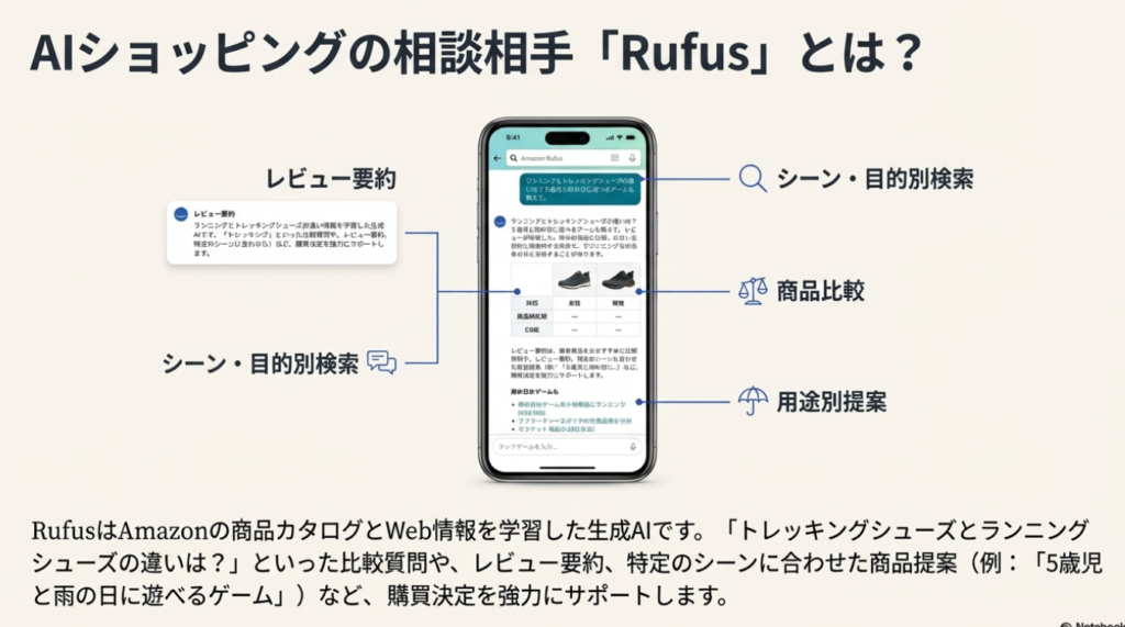 🤖 Amazon Rufus Amazon RufusとはAmazonが開発した生成AIアシスタントです。2024年11月に発表され、2025年9月から日本の全ユーザーが利用可能になりました。Rufus利用者は購入率が60%向上したとされ、対話形式で商品を探せる革新的な機能です。