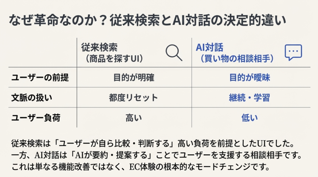 要するに、従来の検索バーは商品を見つけるためのツールだったのに対し、新しいAIアシスタントは買い物の意思決定をするためのパートナーなのです。両者の違いを以下の表にまとめました。