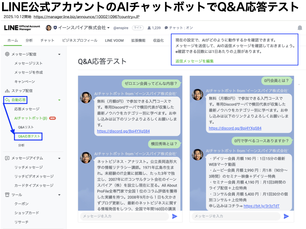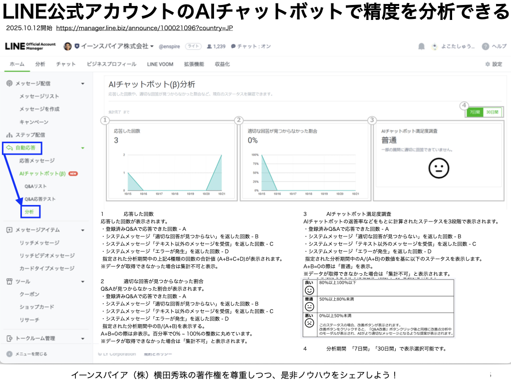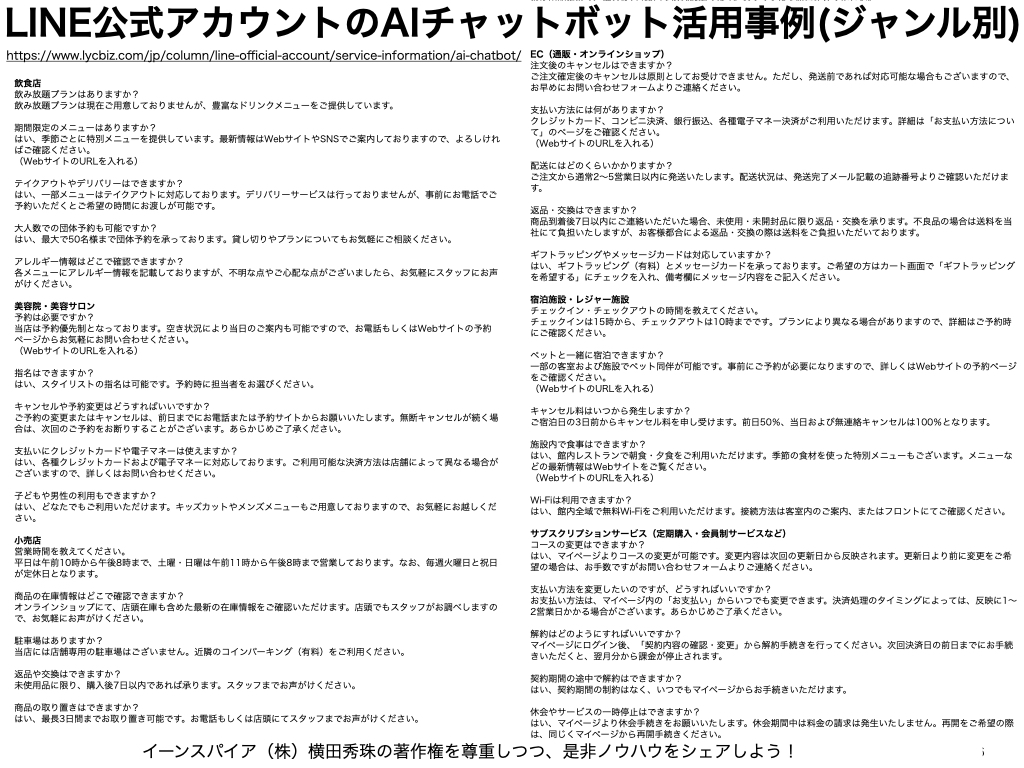 📲 LINE公式アカウント LINE公式アカウントとは、企業や店舗がLINE上で顧客とコミュニケーションできるビジネス向けサービスです。現在はAIチャットボット機能も搭載されており、ECサイトに生成AIチャットを導入する最も簡単な方法の一つとして紹介されています。