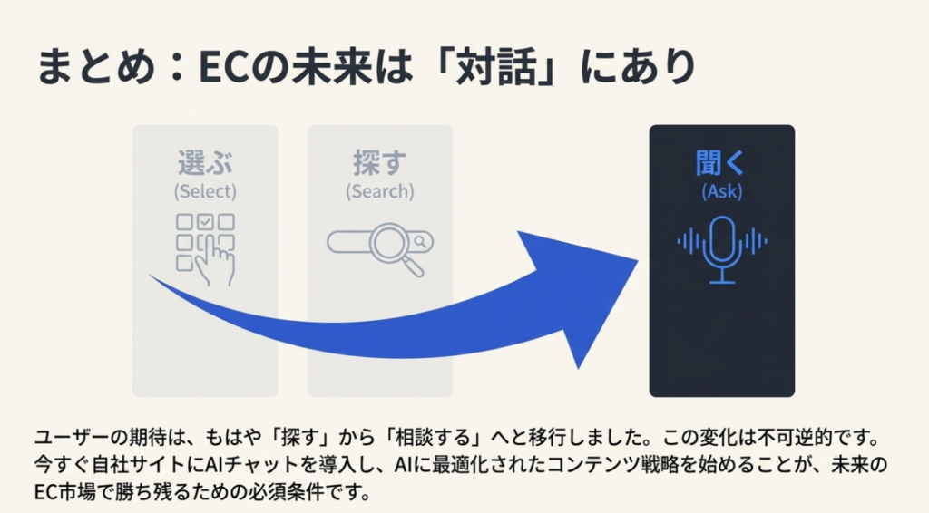 本ドキュメントで解説してきたように、AIはオンラインショッピングのあり方を根本から変えようとしています。重要なポイントは以下の3つです。